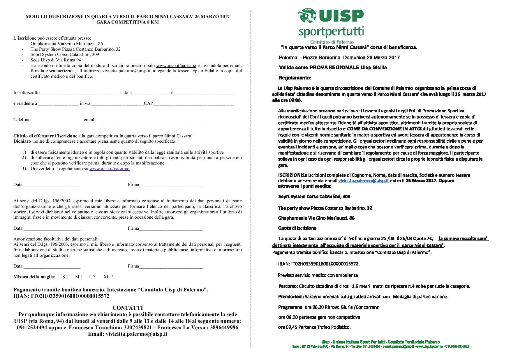 Per le iscrizioni compilare il modulo a fianco, e inviarlo a vivicittà.palermo@uisp.it – pagamento tramite bonifico bancario
