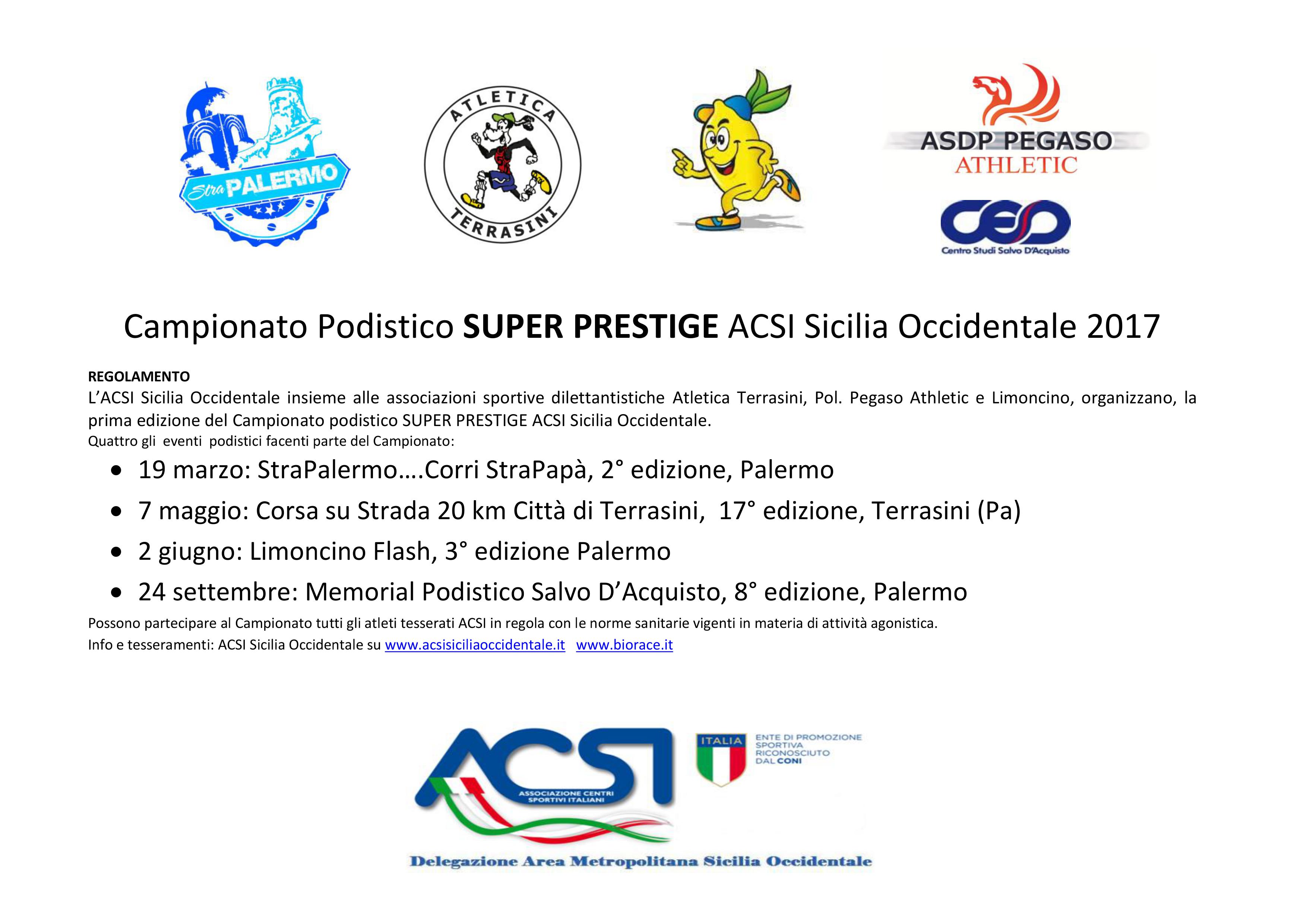 Palermo. Sarà battezzato domenica prossima (19 marzo 2017) con lo svolgimento della STRAPALERMO il primo Campionato Super Prestige ACSI Sicilia Occidentale.