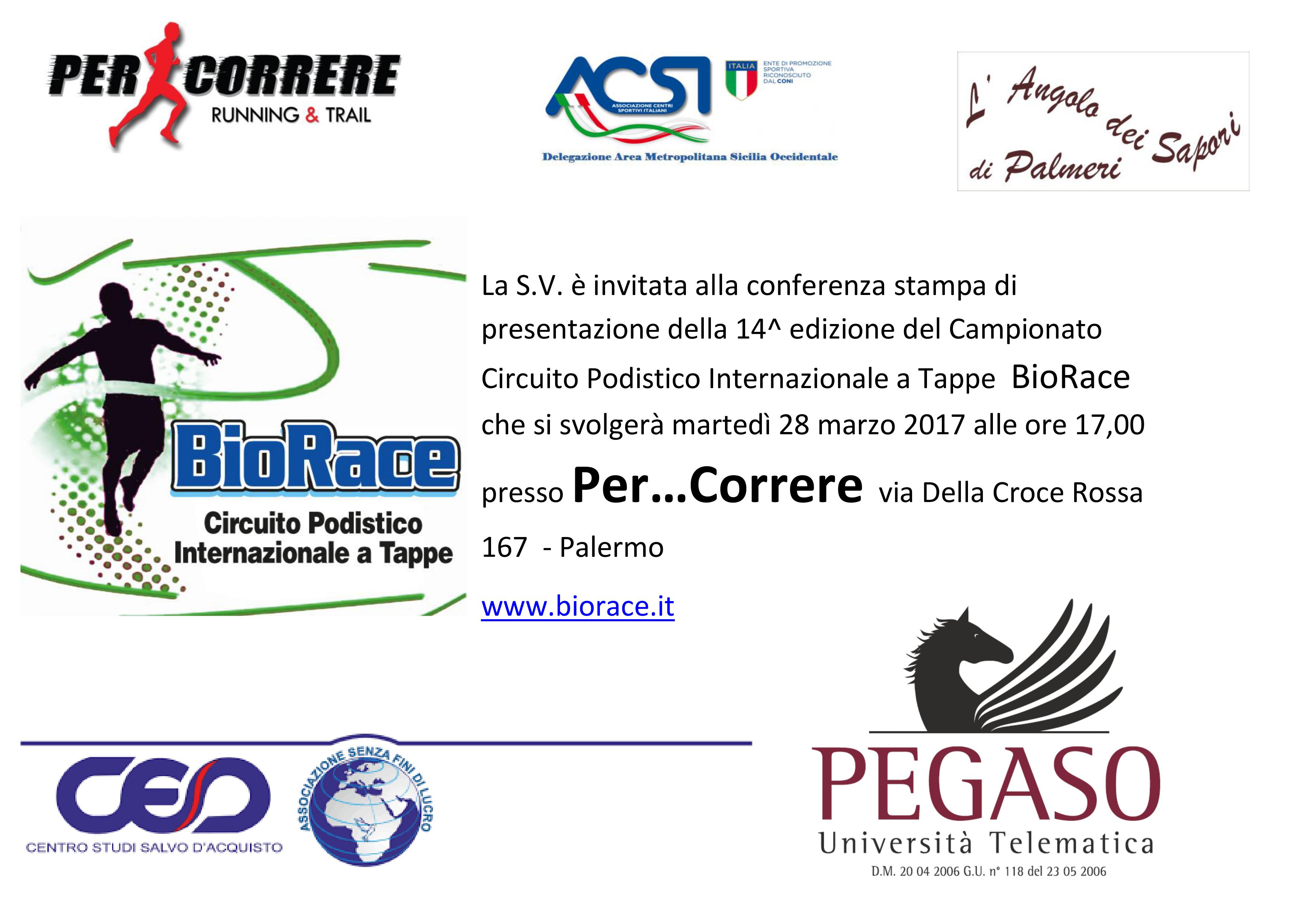 Palermo: Sarà presentato martedì 28 marzo alle ore 17, il calendario degli eventi della quattordicesima edizione del Campionato BioRace Trofeo Pegaso/Per…Correre.