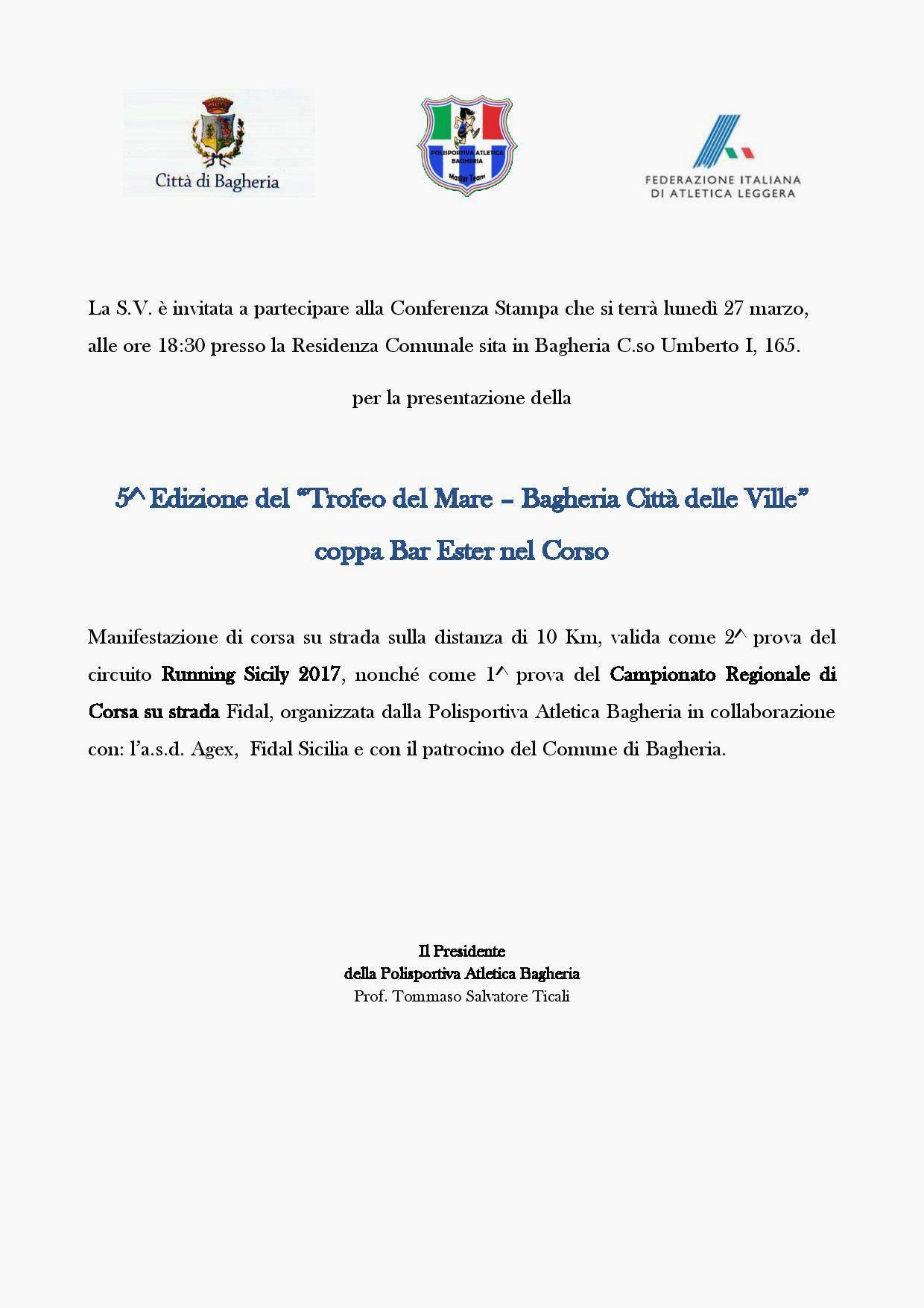 coppa Bar Ester del Corso, gara di corsa su strada sulla distanza di 10 Km. La manifestazione, valida come 2^ prova del circuito Running Sicily 2017 e come 1^ prova del CdS di Corsa su strada Fidal, è organizzata dalla Polisportiva Atletica Bagheria in collaborazione con l’A.s.d. Agex, Fidal Sicilia e con il patrocino del Comune di Bagheria. Nel corso della conferenza stampa saranno rese note le tutte le novità della manifestazione a cominciare dal percorso omologato Fidal che permetterà d’iscrivere ufficialmente i propri tempi nel ranking della Fidal nazionale. Nel corso dell’incontro, il giornalista Rosario Mazzola, riceverà il premio giornalistico assegnatogli dagli organizzatori.