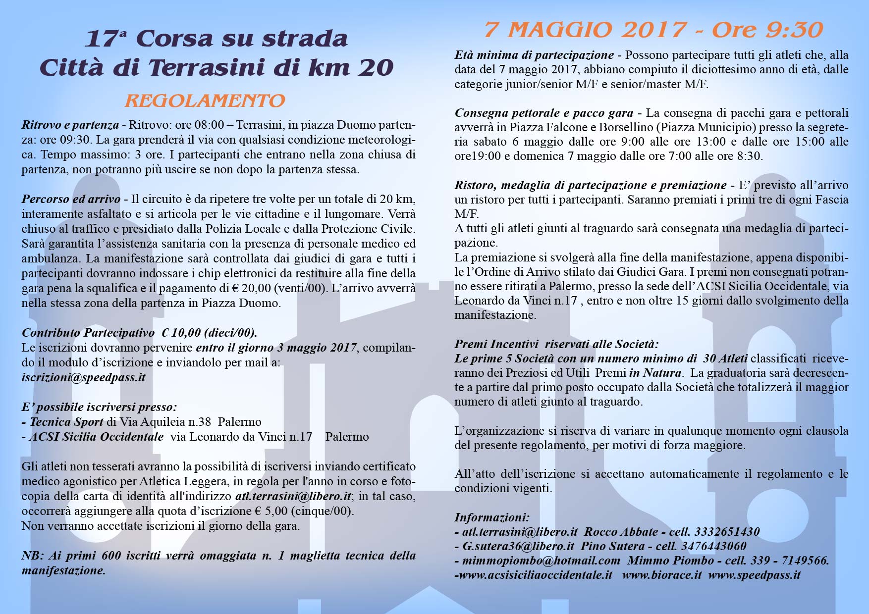 In programma domenica 7 maggio la 17a edizione della gara podistica Città di Terrasini – corsa su strada di 20 km. La manifestazione è valida come II prova del Campionato podistico Super Prestige Acis Sicilia Occidentale 2017 e come prova Challenger del Biorace.