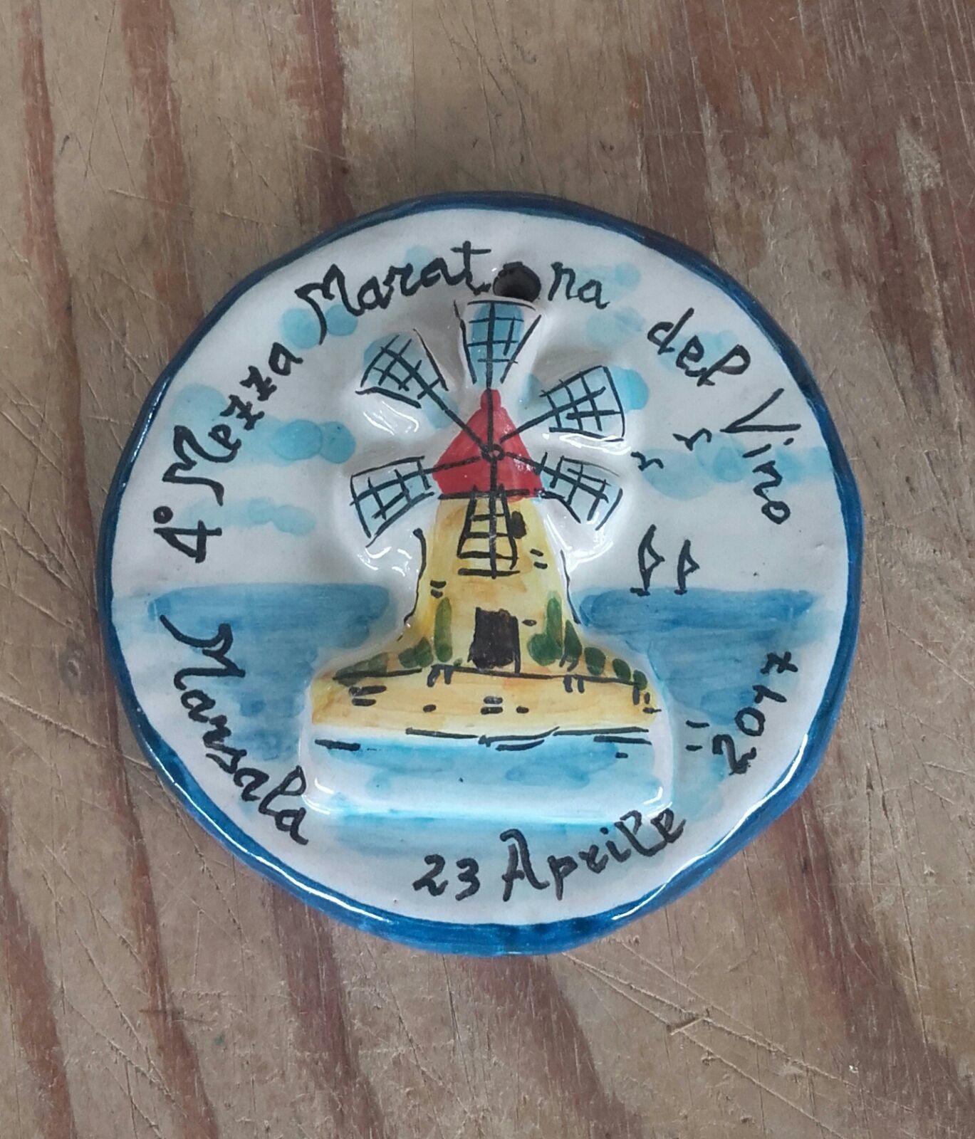 La medaglia, in ceramica, è disegnata da un maestro artigiano e raffigura il classico mulino a vento con alle sue spalle le acque della riserva naturale dello Stagnone.