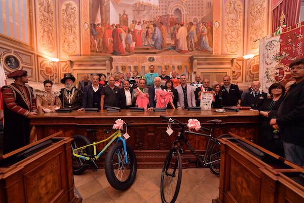 La Corsa Rosa, in collaborazione con ANCMA (Associazione Nazionale Ciclo Motociclo Accessori), i comuni di Foligno e di Montefalco, insieme all’Associazione di pubblica assistenza Croce Bianca di Foligno, ha voluto donare alcune biciclette, alcune maglie delle squadre presenti al Giro – autografate dai corridori – e alcune Maglie Rosa, come segno di vicinanza e auspicio di “ripartenza” alle popolazioni colpite dal terremoto.
