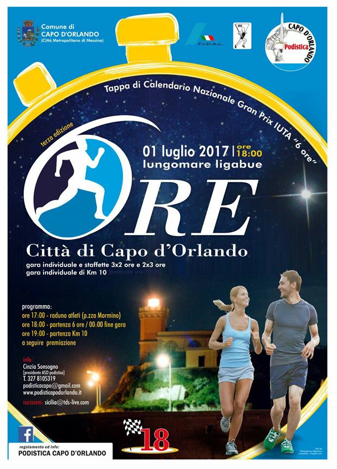 C’eravamo lasciati a fine dell’ottobre scorso con un’edizione indimenticabile, per numero di partecipanti ma soprattutto per attestazioni di gradimento. Una seconda edizione della 6 Ore di Capo d’Orlando bella ed emozionante. A meno di nove mesi da quell’evento, il primo luglio la storia si ripeterà con la terza edizione della 6 Ore di Capo d’Orlando, nuova data stesso marchio. L’evento infatti è organizzato dall’ A.S.D. “Podistica Orlandina”, sotto l’egida della I.U.T.A. e della Fidal, con il patrocinio del Comune di Capo d’Orlando e la collaborazione e del G.G.G. di Messina. La manifestazione sarà valida come Tappa del Calendario Nazionale del Grand Prix IUTA “6 Ore”.