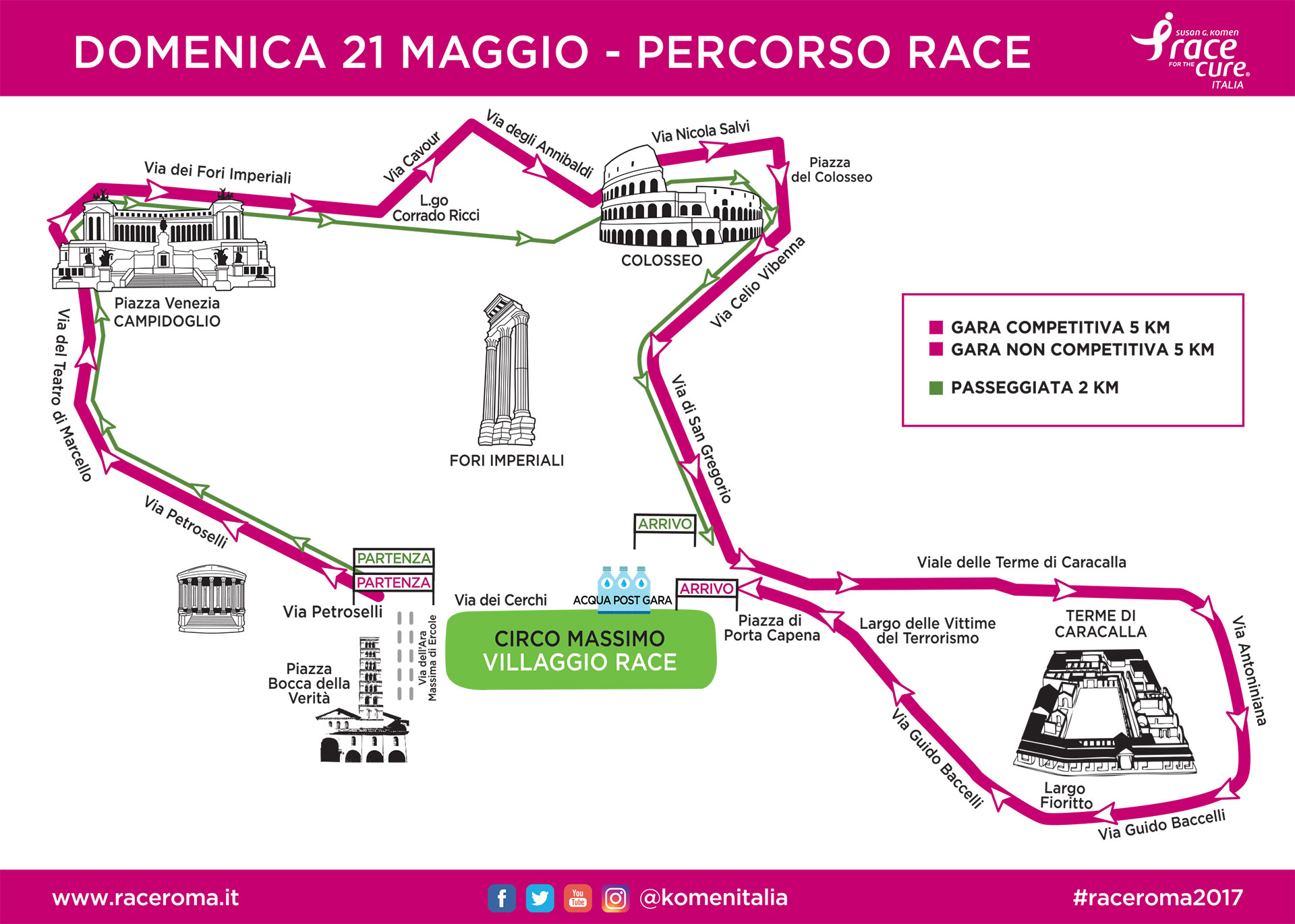 La corsa, che quest’anno vedrà alla partenza oltre 60000 persone, prenderà il via da via Petroselli, all’altezza della Bocca della Verità e si snoderà lungo il consueto percorso di 5km che attraversa alcuni dei luoghi più suggestivi del centro di Roma. Per tutti coloro che vorranno comunque esserci, correre, camminare, passeggiare e colorare le vie della città, parallelamente alla gara competitiva sarà possibile cimentarsi sul percorso di 2 chilometri.