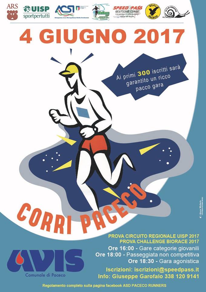 Paceco (TP). Una festa attesa per un anno intero quella organizzata dalla ASD Paceco Runnersdomenica prossima (04 giugno 2017) per le vie del caratteristico Comune di Paceco (Tp) in occasione della nona edizione della “Corri Paceco”.