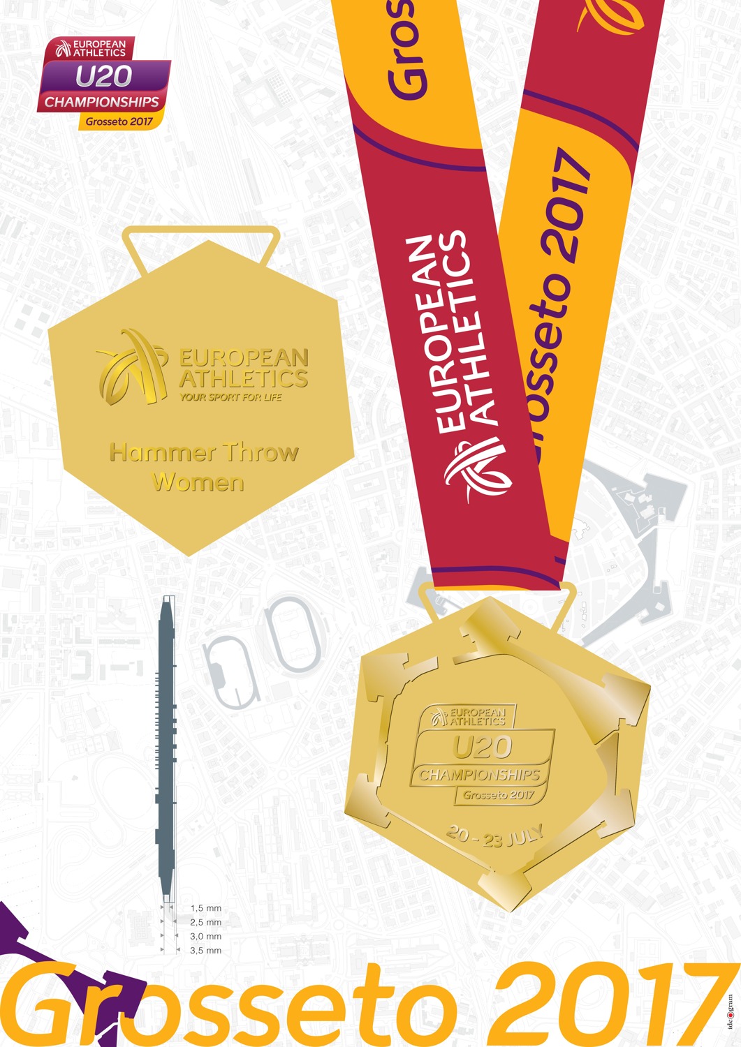LA MEDAGLIA – Un disegno semplice, ma dalla forma inconsueta e originale per una medaglia: l’esagono irregolare che rielabora il perimetro delle Mura medicee, simbolo di tutta la Maremma. Il profilo della cinta muraria è in rilievo e lucido, come il logo della manifestazione inserito al centro, invece la base è satinata. Sul retro compaiono il marchio European Athletics in rilievo e il nome della gara che verrà inciso, mentre il nastro colorato pone in risalto il logo dell’associazione europea e la scritta Grosseto 2017. Il disegno è stato realizzato dall’architetto Francesca Guidi di Ideogram. Dopo la mascotte, che sarà il grifone Leopoldo, anche la medaglia propone quindi forti riferimenti al territorio.