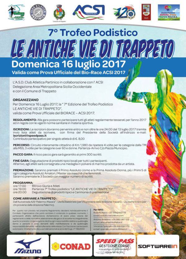Trappeto (PA). Ritorna per la settima volta l’appuntamento podistico di metà luglio a Trappeto denominato “Le Antiche Vie di Trappeto”. La ridente cittadina marinara che si affaccia sul Golfo di Castellamare si prepara ad accogliere domenica 16 luglio ’17 centinaia di atleti ed i girini del Campionato BioRace Trofeo Pegaso/Per…Correre.