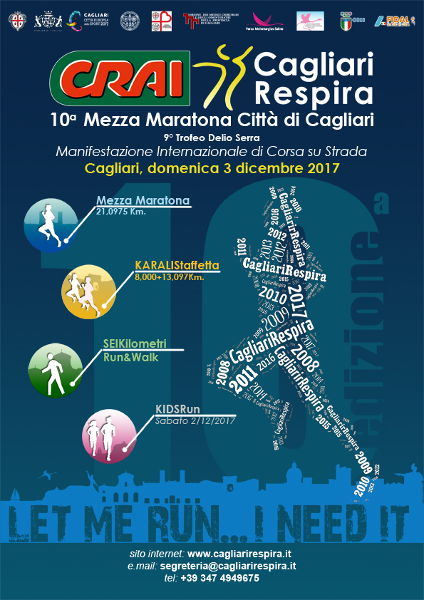 CAGLIARI – Domenica 3 dicembre 2017, con partenza alle ore 10:00, si terrà la decima edizione della CRAI Mezza Maratona di Cagliari – la CagliariRespira 2017, nono Memorial Delio Serra, gara podistica stradale sulla distanza dei 21k caratterizzata da un percorso veloce e filante tracciato su un unico giro cittadino che abbraccerà tutto il centro storico e le zone del Poetto e delle Saline, fino al Parco naturale di Molentargius. Ecocorsa contraddistinta anche da un chilometro di sterrato all’interno del Parco di Molentargius, la 21k cagliaritana partirà da viale Diaz davanti all’Hotel Panorama e si concluderà presso lo Stadio dell’Atletica.