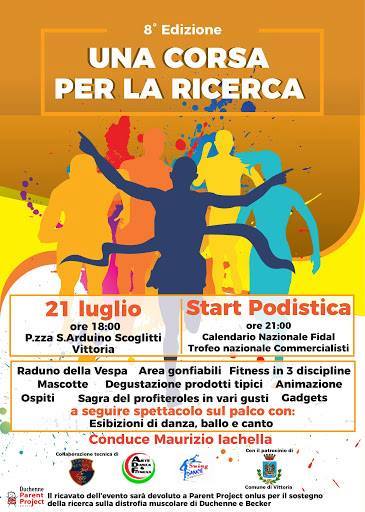 Venerdì 21 luglio, dalle ore 18.30, si terrà, a Scoglitti, l’ottava edizione del trofeo Parent Project “Una corsa per la ricerca”. La manifestazione di corsa podistica, organizzata da Parent Project onlus con l’assistenza tecnica della società podistica Barocco Running Ragusa ed inserita nel tabellone del Grand Prix Provinciale Ibleo 2017 di corsa su strada, avrà la finalità di sostenere progetti di ricerca scientifica sulla Distrofia muscolare di Duchenne e Becker.