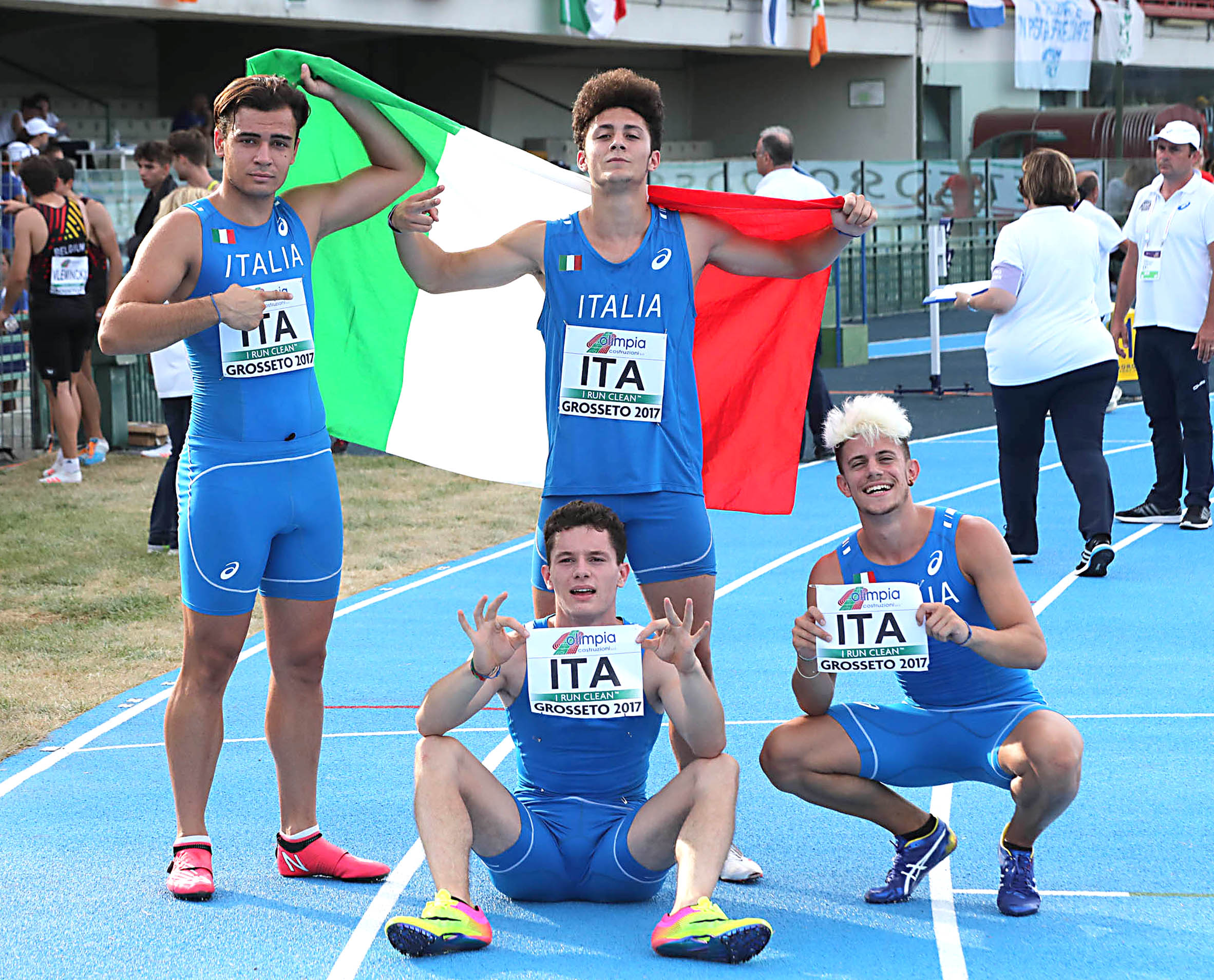 Ai Campionati Europei Under 20 di Grosseto l’Italia fa scintille con la 4×100 maschile capitanata dal campione europeo dei 100 metri Filippo Tortu che nell’ultima frazione arriva ad appena due centesimi dall’oro della Germania che vince in 39.48. Il quartetto azzurro con l’emiliano di origine romena Alessandro Zlatan, il siciliano Nicholas Artuso, il romano Mario Marchei e il lombardo con radici sarde Tortu porta il testimone al traguardo in 39.50. E’ record italiano junior, battuto dopo 22 anni il precedente limite nazionale di 39.61 realizzato dalla staffetta azzurra Alaimo-Ibba-Paggi-Comparini a Nyiregyhaza (Ungheria) nel 1995.