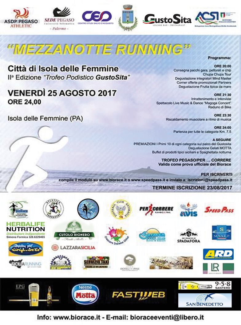 Si svolgerà venerdì prossimo la seconda edizione della “Mezzanotte Running Città di Isola delle Femmine” Trofeo Gustosita in programma allo scoccare della mezzanotte sullo splendido lungomare di Isola delle Femmine (PA).