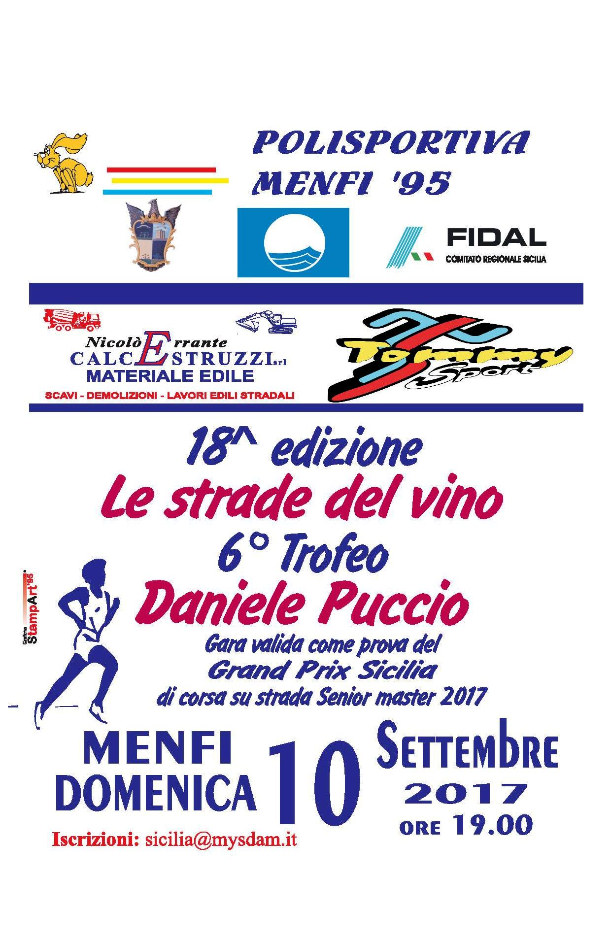 Menfi (Ag). Organizzato dalla Polisportiva Menfi ’95, si svolgerà il prossimo 10 settembre la 18° edzione de Le strade del Vino – sesto memorial Daniele Puccio. L’evento sarà valido come ottava prova del Grand prix regionale di corsa su strada S/M. La manifestazione vedrà il via alle ore 19 da piazza Vittorio Emanuele.