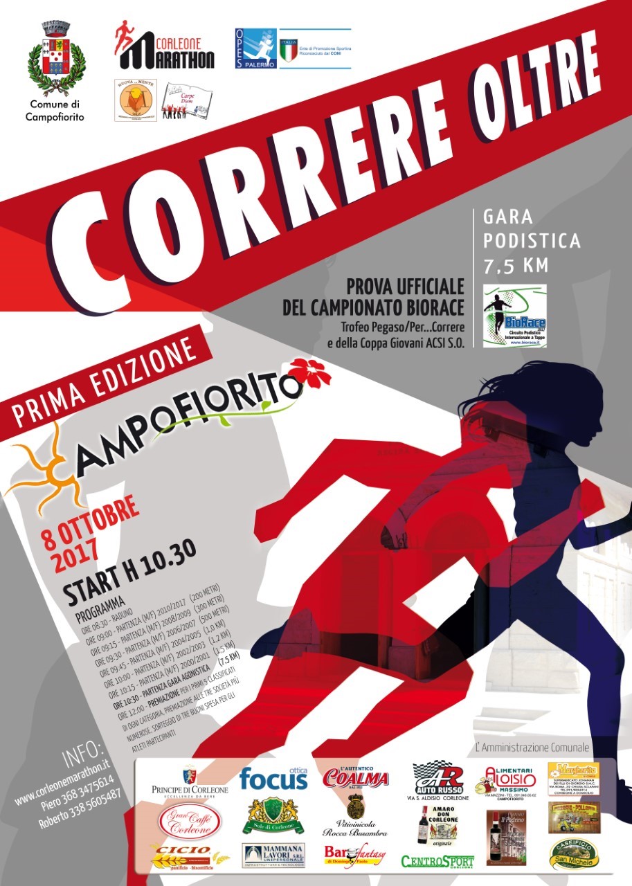 Campofiorito (Pa). Sarà la splendida cittadina di Campofiorito in provincia di Palermo ad ospitare la prima edizione della “Correre Oltre” manifestazione podistica organizzata dalla ASD Corleone Marathon con la collaborazione dell’ EPS OPES con il patrocinio del Comune di Campofiorito.
