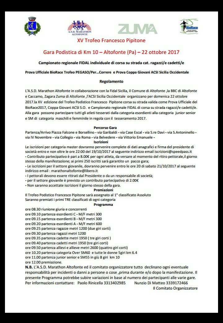 Le iscrizioni dovranno essere inviate entro il 19 ottobre ’17 a iscrizioni@speedpass.it complete di dati, il ritrovo e fissato alle ore 8,30 nella centrale Piazza Falcone e Borsellino da dove dalle ore 9,00 partiranno a seguire tutte le serie giovanili in programma, alle 10,20 circa la partenza della gara riservata agli Over M60 e tutte le Donne sulla distanza di 6400 metri, alle ore 11 circa la partenza della gara clou sulla distanza di 10.000 metri con in palio il prezioso Trofeo F. Pipitone che andrà al primo ed alla prima arrivati assoluti.