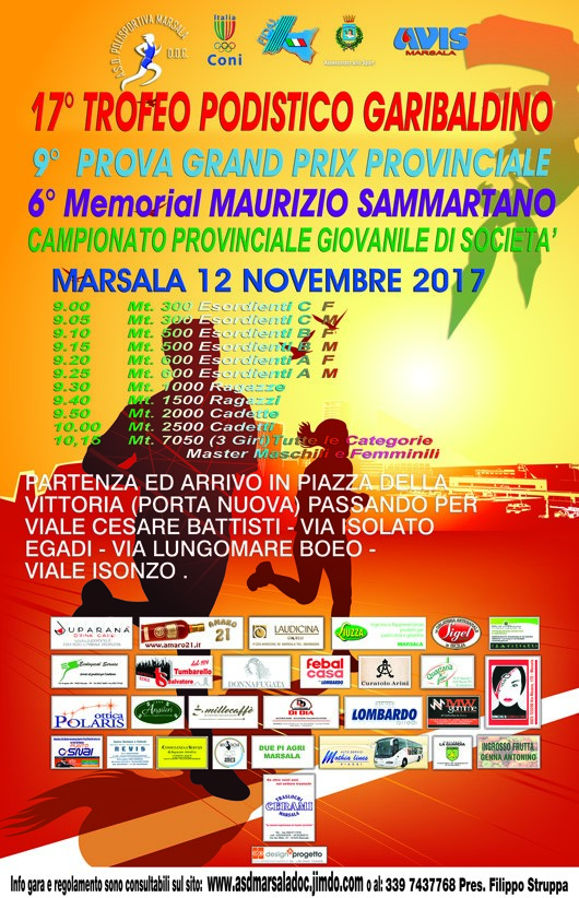 La Polisportiva Marsala DOC, con il patrocinio del comune di Marsala , organizza il 17° trofeo podistico garibaldino. La manifestazione, in programma domenica 12 novembre, sarà valida come 9° prova del Grand Prix provinciale Fidal, campionato provinciale giovanile individuale e di società Fidal e come 6° memorial Maurizio Sammartano.