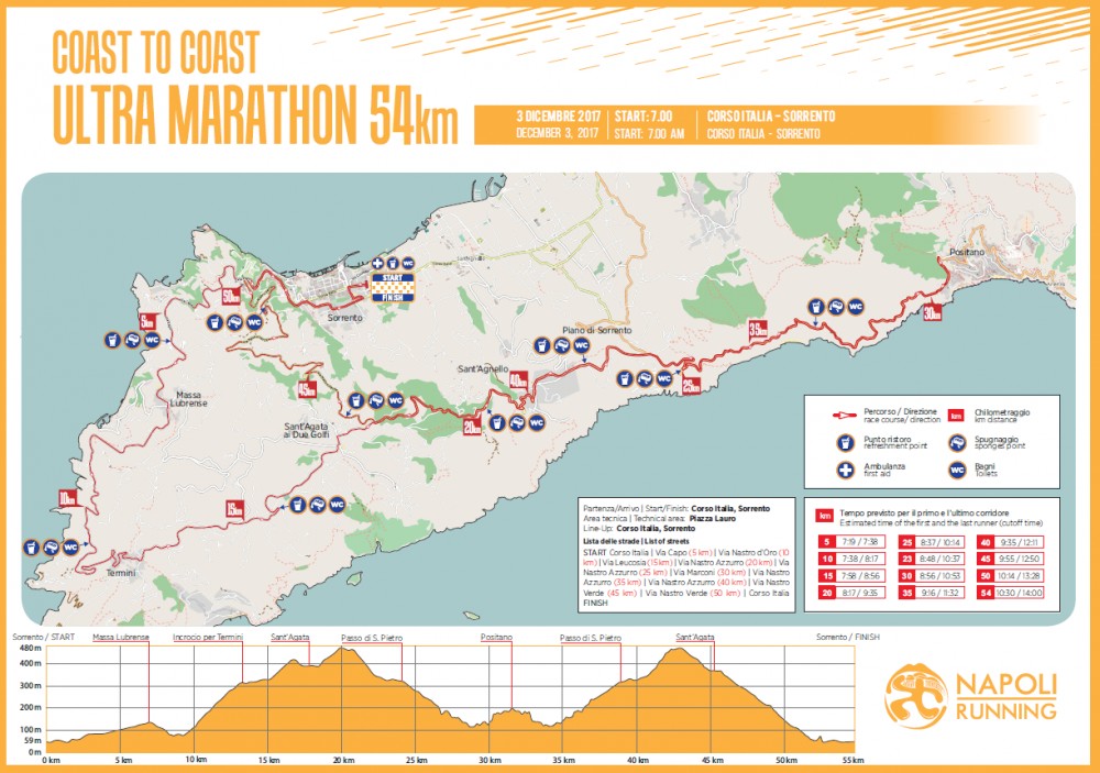 TEMPO LIMITE – L’ultramaratona avrà un tempo di percorrenza massimo di 7 ore con passaggio obbligato al 18km (bivio S.Agata sui due golfi) entro le ore 09:20, al 31km entro le ore 10:40 (tappeto di rilevamento TDS) ed al 45km (bivio S.Agata sui due golfi) entro le ore 13:00. Il passaggio oltre questo orario obbliga l’atleta al ritiro dalla competizione e continuare sul mezzo di trasporto predisposto dalla organizzazione.