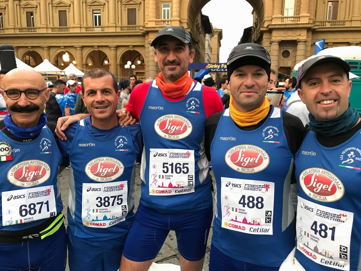 E tra i biancazzurri, il primo a tagliare il traguardo nel capoluogo toscano è stato Michele D’Errico, che non finisce di stupire. Non solo, infatti, a distanza di appena una settimana ha corso un’altra maratona (sette giorni prima a Palermo), ma lo ha fatto con un tempo di tutto rispetto: 3 ore, 25 minuti e 8 secondi. E anche Giuseppe Torre, al suo esordio sulla distanza, ha fatto un buon tempo: 3:32:00. A seguire, sono arrivati Peppe Cerame (3:32:38), Peppe Mezzapelle (3:33:20) e Bruno Manfrè (4:32:21). “Dall’inizio fino a quasi la fine del percorso – commenta Peppe Cerame – la pioggia e il vento ci hanno tenuto compagnia, ma la cosa più importante è stata tagliare il traguardo è vivere un altra bellissima emozione”.