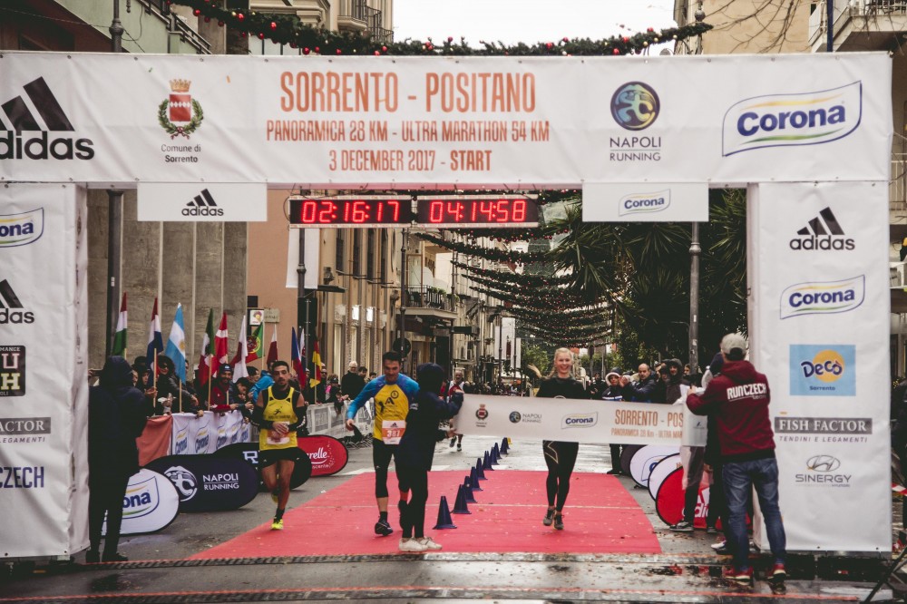 SORRENTO – Ha vinto la forza, l’entusiasmo e la voglia di esserci da parte di tantissimi runner che questa mattina si sono presentati al via della 9a Sorrento-Positano Coast to Coast, la prima edizione interamente organizzata da Napoli Running, con le due nuove distanze, l’ultramaratona da 54km che si è spinta fino a Positano e la Panoramica da 28km, oltre alla Family Run&Friends che si è svolta interamente a Sorrento. Start della gara alla 7 del mattino, ancora col buio e la pioggia che nell’arco della mattinata si è trasformata in sole poi ancora in pioggia e perfino grandine. Condizioni meteo difficili, temperatura di soli 8 gradi, che ha reso tutto molto più difficile ma anche epico, il maltempo non ha scalfito i partecipanti, la loro passione è qualcosa di superiore.