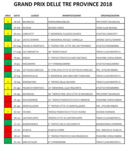 Ventuno gare in tutto, distribuite su tre aree, ognuna delle quali dunque porterà in dote sette appuntamenti podistici. Questo in estrema sintesi l’identikit del Grand Prix delle Tre province 2018, circuito che comprende le province di Agrigento, Caltanissetta ed Enna. Un calendario che si presenta più snello rispetto a quello dello scorso anno e che soprattutto prenderà il via già nel mese di febbraio (lo scorso anno partì a maggio n.d.r.) consentendo alle stesse manifestazioni di spalmarsi nel corso dei mesi che verranno.