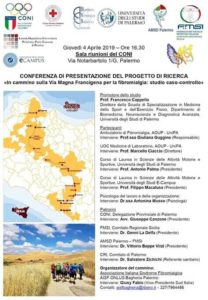 Il progetto di ricerca, prevede che un gruppo di pazienti affetti da fibromialgia e di accompagnatori, percorrano a piedi l’antico cammino tra Palermo e Agrigento tra il 27 aprile e il 5 maggio 2019: nove tappe per un totale di poco più di 180 km che saranno affrontate con fatica ma con grande determinazione da diverse persone affette da questa patologia.