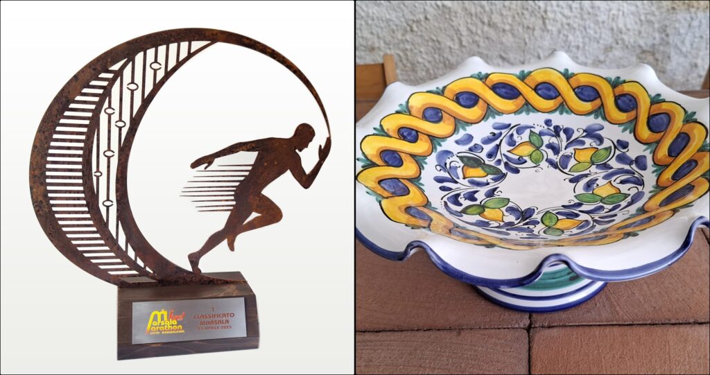 Per quanto riguarda i premi per i primi assoluti della mezza maratona e per tutti i podi delle categorie FIDAL, gli organizzatori hanno pensato ad una “alzata” in ceramica, manufatto realizzato a mano dai maestri artigiani marsalesi.