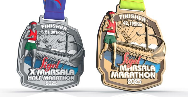 La medaglia della Marsala Marathon, con la sua fusione di natura, storia e cultura, non è solo un premio per i corridori, ma anche un tributo alla città e al suo patrimonio. Ogni elemento, progettato con cura dal designer Vincenzo Maggio della Design&Progetto di Marsala, evoca infatti in un connubio perfetto, l’anima naturale del territorio, dalle saline al mare, dalla nave punica ad un “originale Garibaldi” in veste di runner; tutto è scelto con cura per rendere omaggio alla ricchezza di Marsala, un luogo dove il passato e il presente si intrecciano e dove ogni corsa rappresenta un passo verso il futuro, trasformando ogni traguardo in un frammento di storia vissuta. Due le versioni, quelle dorata di dimensioni generose per coloro che porteranno a termine la distanza dei 42,195 km ed una argentata, dal diametro un po’ più piccolo, per coloro che “chiuderanno” la distanza dei 21,097 km.