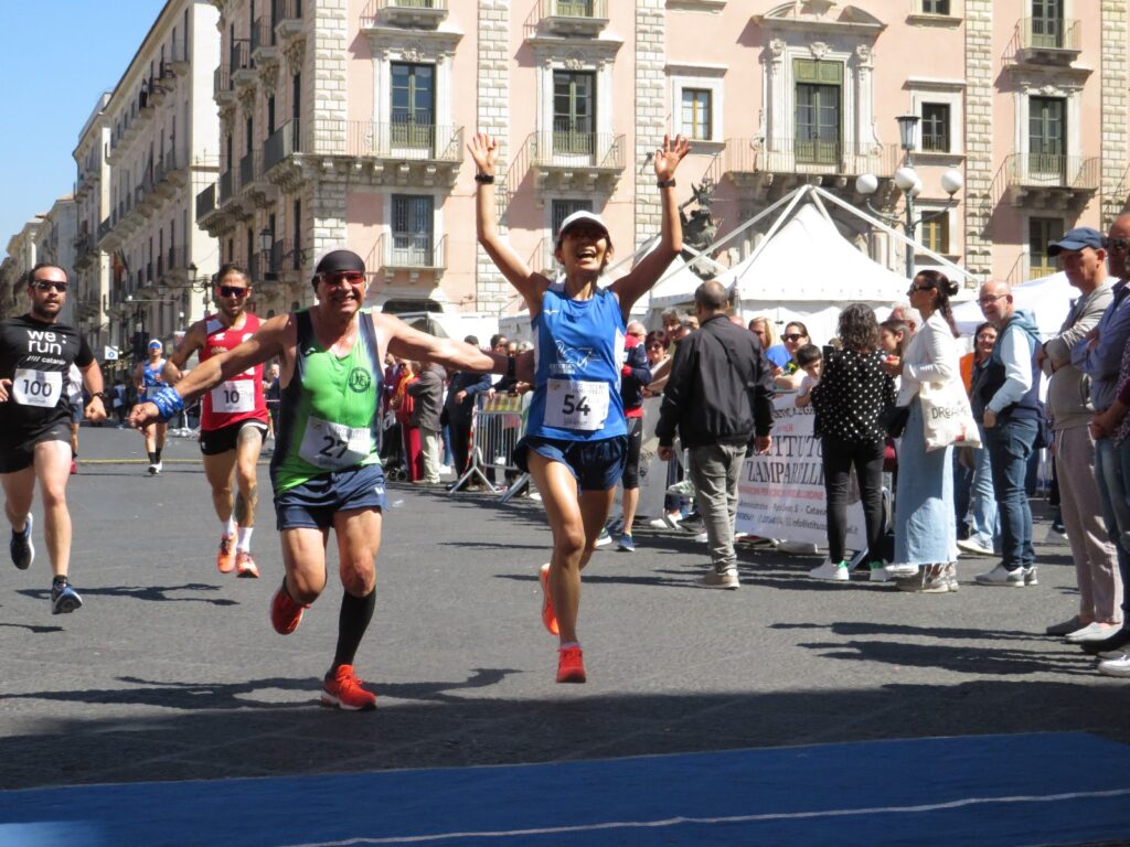Più combattuta la gara femminile con Patrizia Strazzeri della Scuola Atletica Leggera Catania che alla fine con il crono di 42:55 ha avuto la meglio sulla giapponese della Catania Running Club, Mika Iwaguchi, staccata di 57 secondi sul traguardo di Piazza Università. Terza in 45:26 Angela Susino della Scuola di Atletica Leggera Catania.