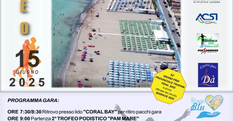 Mazara del Vallo (TP). Per il secondo anno consecutivo la meravigliosa località di Tonnarella a Mazara del Vallo, in provincia di Trapani, ospiterà domenica 15 giugno ’25 il Trofeo “PAM MARE” valido come prova ufficiale del BioRace Trofeo Per…Correre/Spanu Sport e prova del 22° Grand Prix Provinciale Fidal Trapani di corsa su strada.
