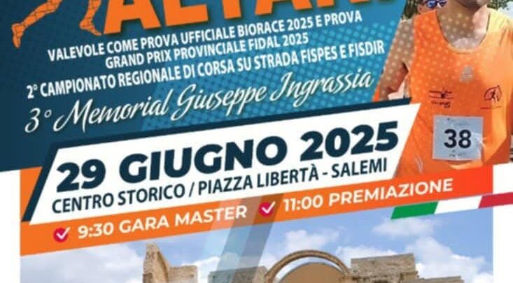 Salemi (TP). La caratteristica Città di Salemi in provincia di Trapani, domenica 29 giugno 2025, ospiterà la decima prova ufficiale del BioRace Trofeo Per…Correre/Spanu Sport in occasione del 13° Trofeo Podistico “Pani e Altari” 3° Memorial Giuseppe Ingrassia.