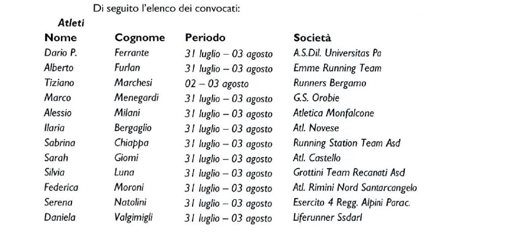 Dodici in tutto gli atleti convocati (sette donne e cinque uomini) sotto l’occhio attento dei tecnici Paolo Bravi e Monica Casiraghi e le mani del fisioterapista Andrea Caspani.