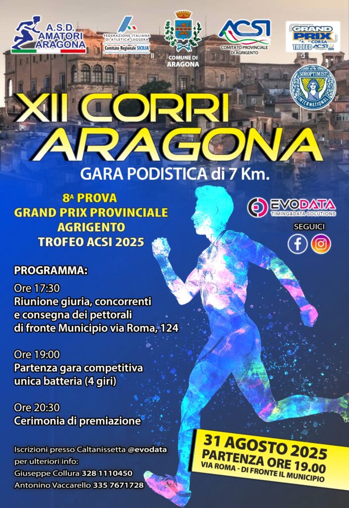 Domenica 31 agosto 2025 le strade del centro cittadino di Aragona, si preparano ad ospitare la 12ª edizione della CorriAragona, gara di corsa su strada organizzata dall’A.S.D. Amatori Aragona, valida come VIII prova del Grand Prix provinciale FIDAL Agrigento – Coppa ACSI 2025.