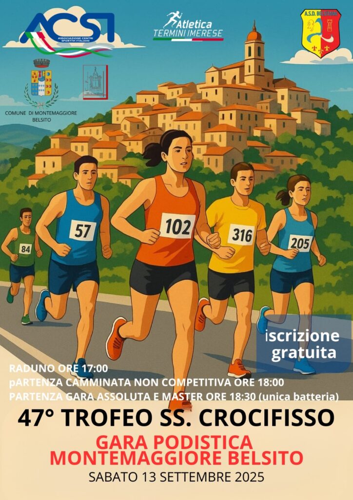 Montemaggiore Belsito (PA) – Un affascinante appuntamento podistico è nuovamente alle porte nel piccolo borgo madonita: sabato 13 settembre andrà in scena la 47ᵃ edizione del Trofeo SS. Crocifisso, manifestazione di punta nella calendarizzazione regionale promossa dall’A.S.D. Belsitana, presieduta da Giuseppe Cascio, in stretta sinergia con l’A.S.D. Atletica Termini Imerese, con il patrocinio del Comune guidato dal sindaco Cosimo Gullo e che vede in prima linea anche l’assessore allo sport Antonio Castiglia e con la collaborazione dell’ ACSI. A garantire il coordinamento dei festeggiamenti patronali, il presidente del comitato, Giuseppe Scimeca.