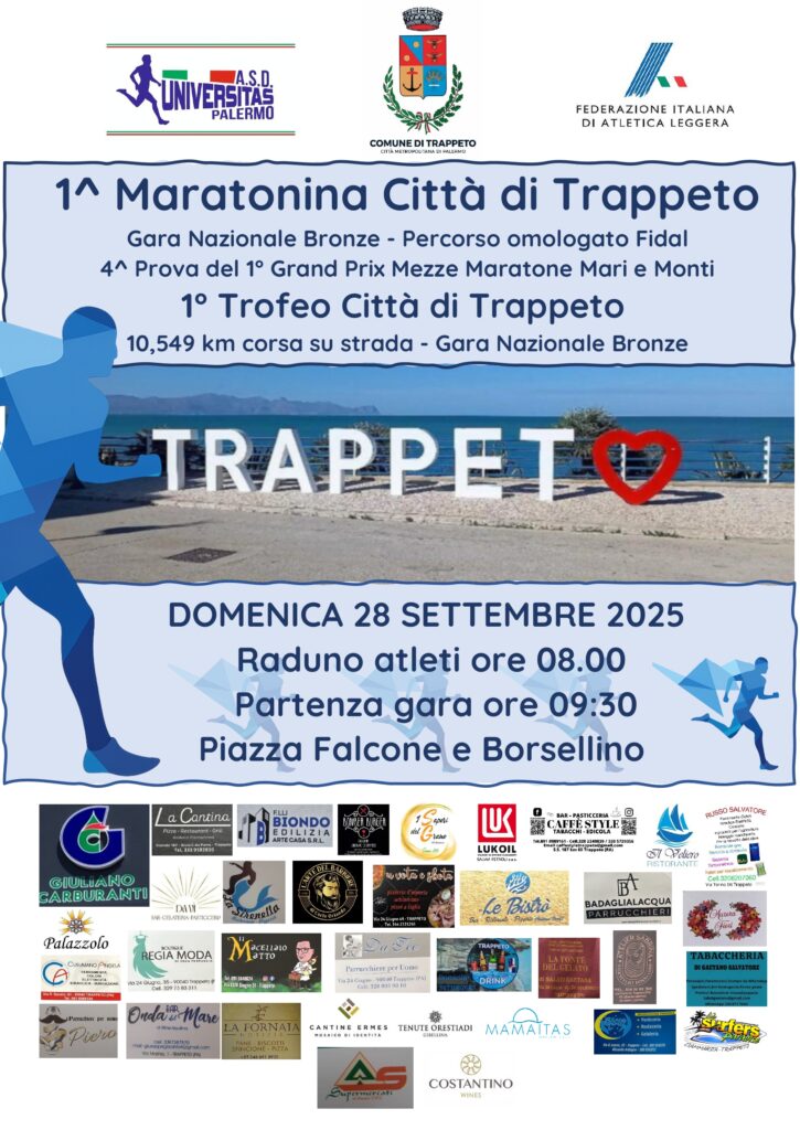 Trappeto è pronta ad accogliere una domenica di grande sport e di festa. Domenica 28 settembre andranno infatti in scena due appuntamenti che richiameranno atleti da tutta la Sicilia e non solo: la 1ª Maratonina Città di Trappeto (21,097 km), valida come prova del Grand Prix regionale di mezze maratone Mare e Monti, e il 1° Trofeo Città di Trappeto sulla distanza di 10,549 km.