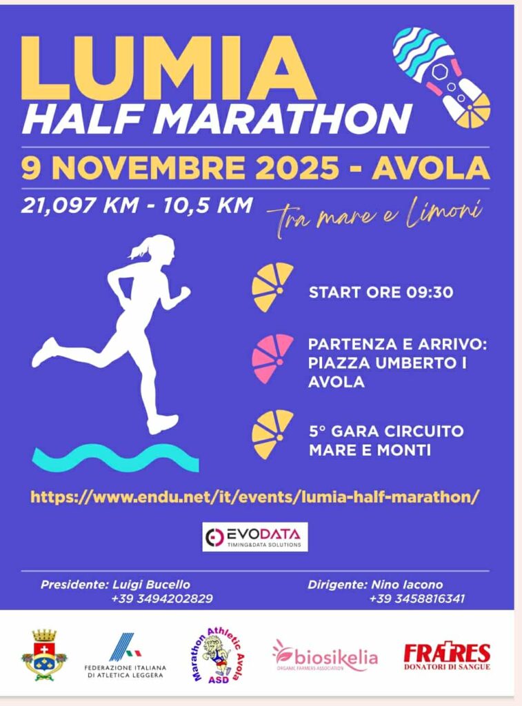 Domenica 9 novembre 2025 Avola si prepara a vivere una giornata di grande sport con la prima edizione della Lumia Half Marathon, organizzata dall’ASD Marathon Athletic Avola con il patrocinio del Comune.
