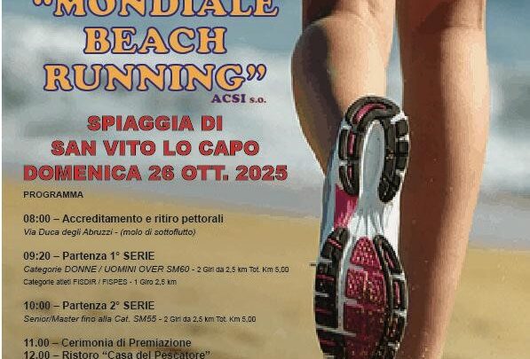 San Vito Lo Capo (TP). La splendida spiaggia di San Vito Lo Capo in provincia di Trapani ospiterà, domenica 26 ottobre 2025, la terza edizione del Mondiale Beach Running ACSI S.O. Trofeo Zero Barriere/Città di San Vito Lo Capo.
