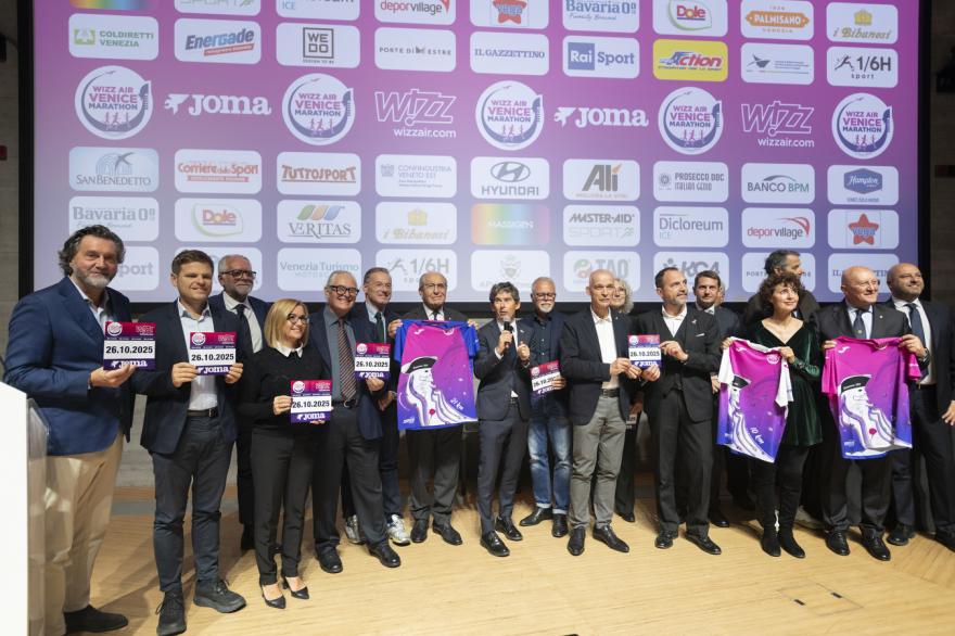 La parola è poi passata al presidente del Comitato regionale FIDAL Veneto, Sergio Baldo: “Non credo che esista in nessuna altra città al mondo una maratona che permette di correre sull’acqua, attraversando un luogo iconico come il Canal Grande, lungo un ponte galleggiante di barche costruito apposta per l’occasione. Venicemarathon è unica al mondo, non solo per la bellezza del suo percorso, ma anche per la sua complessità organizzativa e per questo è forte motivo d’orgoglio per tutti noi”. Il coordinatore generale di Venicemarathon Lorenzo Cortesi ha illustrato nel dettaglio i numeri: “Ci saranno 7100 partecipanti nella maratona, 5500 nella mezza e 8000 nella 10K. Altissima la presenza degli stranieri che nella 42K supera il 50% e quella femminile che in generale si attesta attorno al 40% ma che nella 10K supera il numero degli uomini iscritti. Numeri che genereranno un’importante ricaduta economica sul territorio che sicuramente supererà gli oltre 10 milioni dello scorso anno e che renderemo noto appena il nuovo studio sarà pronto. Siamo già proiettati al quarantennale e alle 20 di domenica apriranno già le iscrizioni per l’edizione del 25 ottobre 2026”. Il vice presidente Stefano Fornasier ha sottolineato: “Anche quest’anno abbiamo una gara interessante con atleti provenienti da Kenya, Etiopia, Eritrea e Burundi. Sul percorso ci saranno ben quindici squadre di sanitari a piedi”. Tra gli altri sono intervenuti Federica Bosello, responsabile della comunicazione e rapporti istituzionali dell’Autorità di Sistema Portuale del Mare Adriatico Settentrionale, Andrea Martellato, presidente dell’organizzazione di gestione della destinazione ‘La Riviera del Brenta e Terre dei Tiepolo’, Gianni Albertinoli, governatore del Rotary Distretto 2060, Giulio Marc D’Alberton, responsabile PR & Events Hyundai, e in collegamento Gabriele Imperiale di Wizz Air.