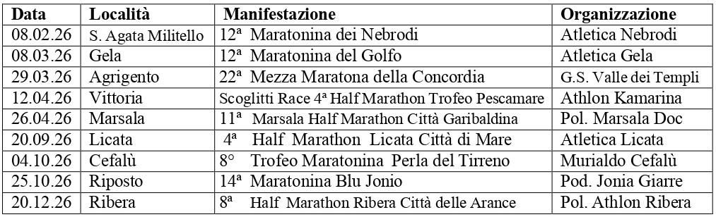 Varato il calendario e il regolamento della 24esima edizione del Grand Prix regionale di Mezze Maratone. Nove gare, la prima domenica otto febbraio a Sant’Agata di Militello con la 12a edizione della Maratonina dei Nebrodi, organizzata dall’Atletica Nebrodi che prevede anche due distanze sulla 7 e 14 km. A seguire subito una novità (per quel che riguarda la data di svolgimento) l’otto marzo infatti si svolgerà a Gela la dodicesima Maratonina del Golfo organizzata dall’Atletica Gela. Le prime news parlano di un percorso tutto nuovo all’insegna dell’arte e della storicità del territorio. Il 29 marzo sarà la volta della 22esima Mezza Maratona della Concordia, organizzata dal GS Valle dei Templi Agrigento. Il 12 aprile a Vittoria la Scoglitti Race – IV Half Marathon Trofeo Pescamare, al cui interno è prevista anche una 10 chimometri. Organizza l’Athlon Kamarina. Domenica 26 aprile a Marsala l’undicesima Marsala Half Marathon Città Garibaldina che si svolgerà all’interno della Sigel Marsala Marathon, organizza la Polisportiva Marsala Doc. Dopo la pausa estiva i riprende il 20 settembre a Licata con la quarta edizione dell’Half Marathon Licata Città di Mare, organizzata dall’Atletica Licata (anche in questo caso prevista anche una gara su misura ridotta). Il 4 ottobre appuntamento a Cefalù con l’ottavo trofeo Maratonina Perla del Tirreno organizzata dal Murialdo Cefaù. Il 25 ottobre a Riposto si corre la XIV Maratonina Blu Jonio, organizzata dalla Podistica Jonia Giarre. Il 20 dicembre a Ribera si chiude il circuito con l’ottava Half Marathon Ribera Città delle Arance, organizzata dall’Athlon Ribera. Anche in questo caso le prime notizie danno al suo interno una 10,5 km mentre anche il percorso dovrebbe cambiare.