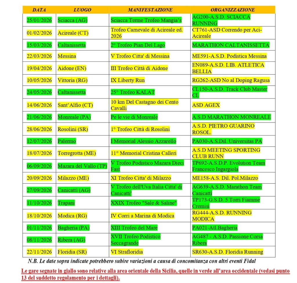 Con la sesta edizione del Trofeo Sciacca Terme, organizzato dalla Sciacca Running, prende il via domenica 25 gennaio il 31° Grand Prix Sicilia (10 km). Il circuito conferma e amplifica la sua struttura capillare sul territorio grazie a 20 manifestazioni inserite nel calendario nazionale FIDAL, equamente distribuite in tutte le province dell’Isola. Una scelta che ribadisce l’obiettivo centrale del progetto: valorizzare ogni angolo della Sicilia e garantire a un numero sempre maggiore di atleti la possibilità di partecipare. Nel frattempo, rispetto all’ultimo calendario venuto fuori, è cambiata una data. La VI StraFloridia (organizzazione Floridia Running di terrà il 22 novembre e chiuderà l’edizione 2026 del circuito regionale di gare sulla distanza dei dieci chilometri.