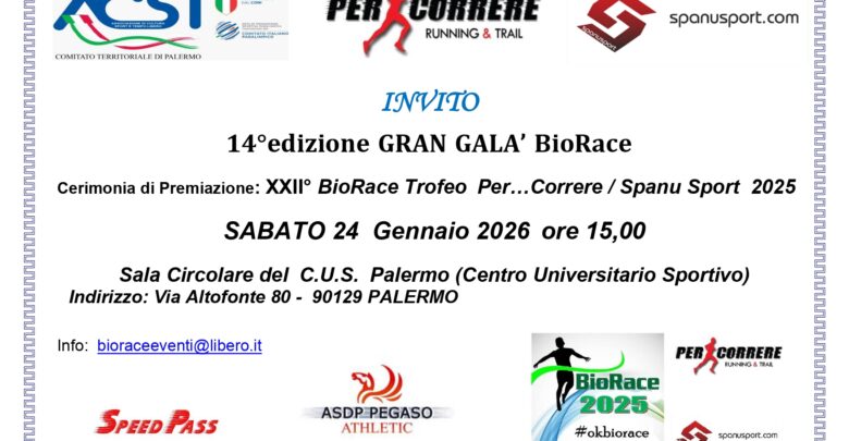 Palermo: Si svolgerà sabato 24 gennaio 2026 dalle ore 15:00 presso la Sala Circolare del C.U.S. Palermo di via Altofonte n°80 a Palermo la quattordicesima edizione del Gran Galà BioRace.