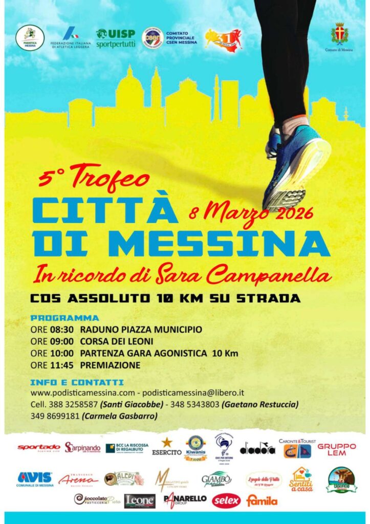 Il “Trofeo Città di Messina” assume quest’anno un significato ancora più profondo. La gara in programma l’8 marzo nel giorno della Giornata Internazionale della Donna, giunta alla sua quinta edizione, come segno di ricordo, rispetto e memoria, sarà dedicata a Sara Campanella, la ventiduenne studentessa originaria di Misilmeri, vittima di femminicidio a Messina. La manifestazione, indetta dalla FIDAL e organizzata dalla Podistica Messina del presidente Santi Giacobbe, con la collaborazione del Comune di Messina, è stata anticipata a causa del referendum previsto per il 22 e 23 marzo. È valida anche per il Campionato Regionale di Società Assoluto di corsa su strada 10 km e come prova del “31° Grand Prix Sicilia 2026”, aperta a tutte le categorie FIDAL, da Allievi in su.