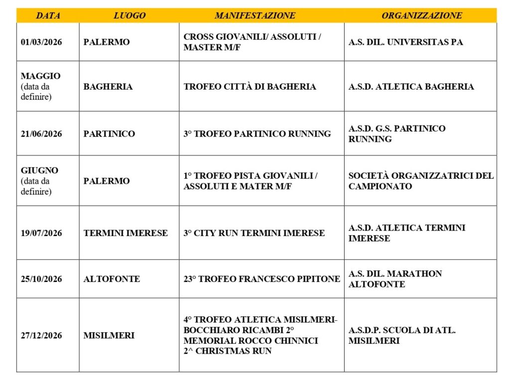 Saranno sette in totale le prove in programma. Dopo l’apertura palermitana, il calendario proseguirà a maggio (data da definire) con il Trofeo Città di Bagheria, organizzato dalla Pol. Atletica Bagheria. Il 21 giugno sarà la volta del 3° Trofeo Partinico Running, sotto la regia del GS Partinico Running. Sempre a giugno (data da definire) l’Universitas Palermo organizza il primo Trofeo Pista Giovanili, Assoluti e Master.