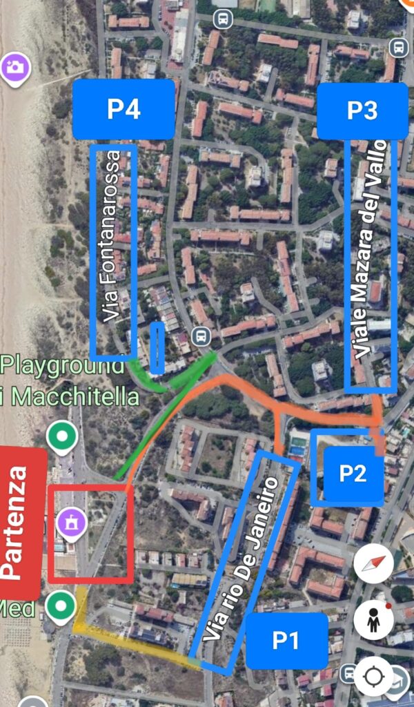 ​🟠 Percorso Arancio: Da Via Rio de Janeiro bassa (P1) , da Via La Paz (P2), da Viale Mazara del Vallo (P3), passando da Viale Cortemaggiore-Lungomare verso la partenza.