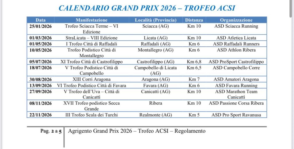 Piccola ma significativa variazione nel calendario del Provinciale di Agrigento – Trofeo ACSI 2026, che resta comunque articolato su undici prove, confermando tutta la solidità e la vivacità del movimento podistico agrigentino.