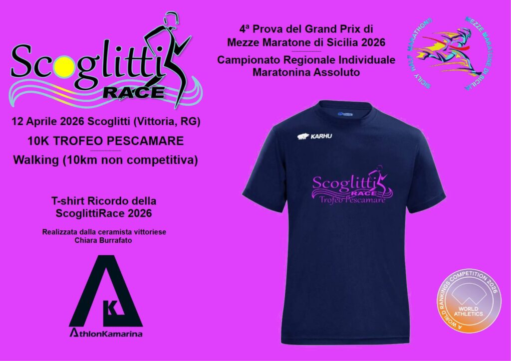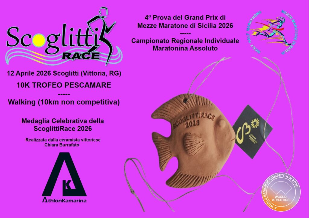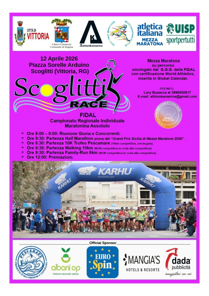 Conto alla rovescia per la ScoglittiRace 4ª Half Marathon, in programma domenica 12 aprile nel borgo marinaro di Scoglitti, in territorio di Vittoria (RG). La manifestazione, organizzata dall’Athlon Kamarina, oltre ad essere valida come quarta prova del circuito del Grand Prix regionale di mezze maratone, assegnerà i titoli regionali individuali Assoluti sulla distanza dei 21,097 km.
