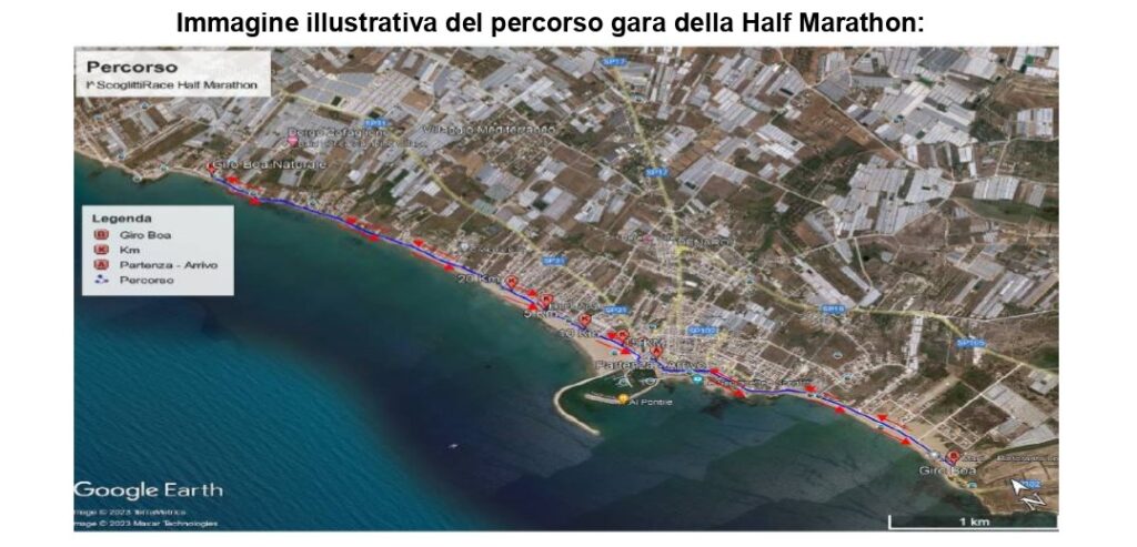 Il percorso è veloce (certificato Fidal e dallo scorso anno omologato anche dalla World Athletics) ed è stato studiato, oltre che per elevare il livello di qualità della sfida agonistica, anche per fare godere appieno delle bellezze naturali che insistono nella splendida frazione di Vittoria. Partenza e arrivo sono previsti a piazza Sorelle Arduino a Scoglitti. Unico giro per la 10 chilometri, due invece i giri per la mezza maratona con una breve appendice di alcuni metri, che gli atleti affronteranno dopo il giro di boa e questo per portare a casa i canonici 21,097 km (START UNICO 9.30)