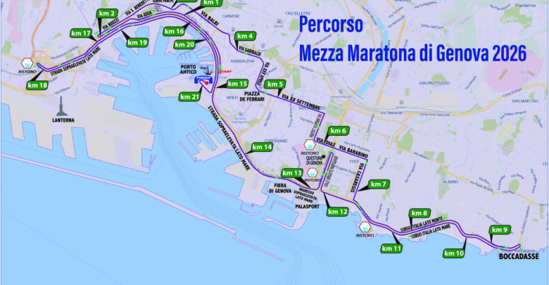 La magia della Mezza risiede nel suo disegno. Dopo lo start fissato alle 09:00 in Via della Mercanzia, i primi 7 km si snodano nel cuore pulsante della città. Poi, l’orizzonte si apre: il lungomare, l’iconica Boccadasse e l’emozione unica di correre sulla Sopraelevata, sospesi tra il blu del Mediterraneo e i palazzi storici, fino al traguardo di Piazzale Mandraccio.