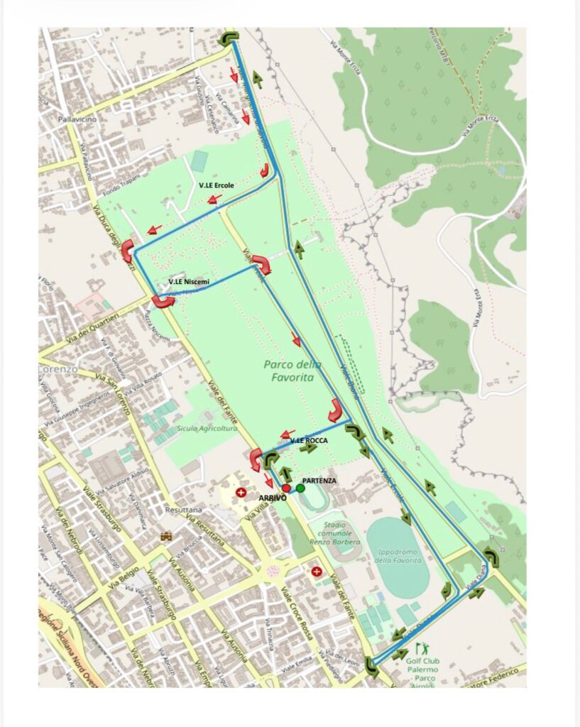 Il tracciato si sviluppa interamente all’interno del Parco della Favorita, su un unico giro di 10 km: un percorso suggestivo e tecnico che attraversa alcuni dei luoghi più rappresentativi dell’area, tra cui Case Rocca, via Ercole, viale Diana, la Palazzina Cinese e il museo Pitrè.