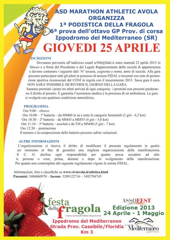 L’ASD Marathon Athletic Avola organizza per il 25 aprile presso l’Ippodromo del Mediterraneo (SR) la “1a Podistica della Fragola” gara…